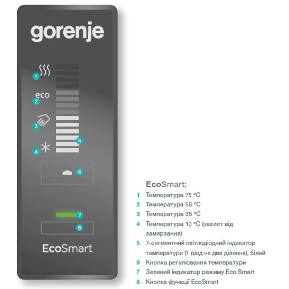 Нагрівач обладнано сучасним електронним блоком керування зі світлодіодними індикаторами та дисплеєм для контролювання температури води. Завдяки додатковій функції EcoSmart досягається ефективність нагрівання - економія у споживанні электроэнергії до 25% у порівнянні зі звичайним водонагрівачем.
