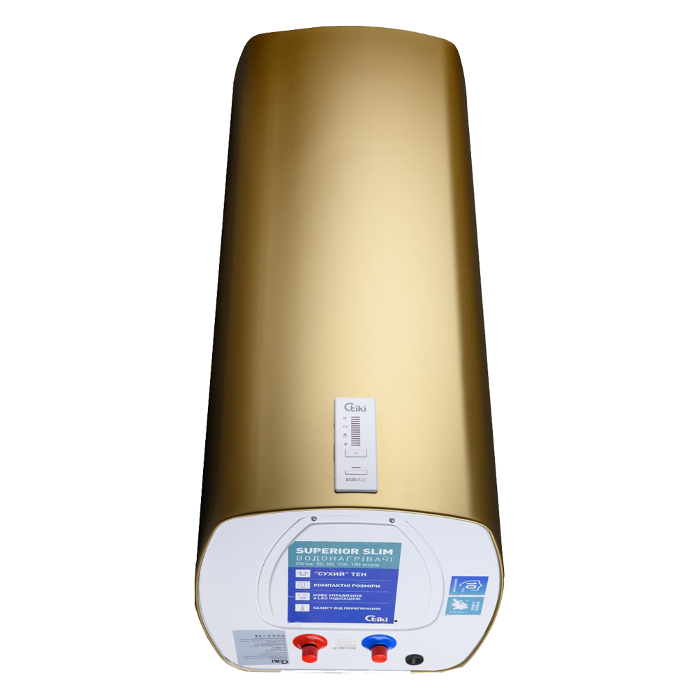 TIKI OGBS 80 E5 Supr SD 80V9 (700090) водонагрівач вертикальний (колір золотий матовий) - електричний накопичувальний водонагрівач з фактичним об'ємом емальованого бака 78 літри та двома "сухими" ТЕНами, загальною потужністю 2 кВт. Монтаж бойлера настінний, вертикальний.